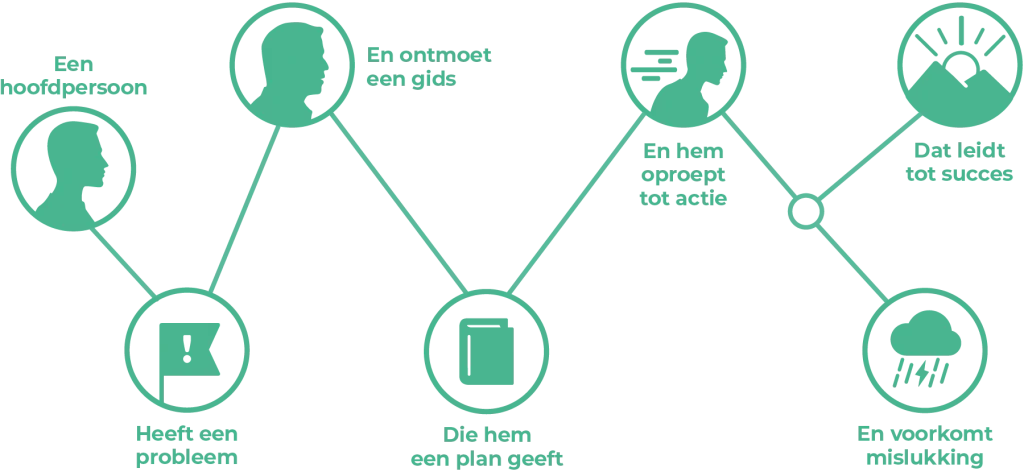 Het model bouwt op de structuur van een goed verhaal: een held met een probleem, die een gids ontmoet, een plan krijgt en vervolgens in actie komt richting succes. Oftewel: herkenbaar, helder en gericht op wat de klant echt wil.